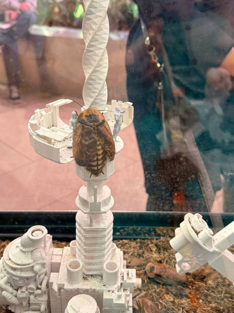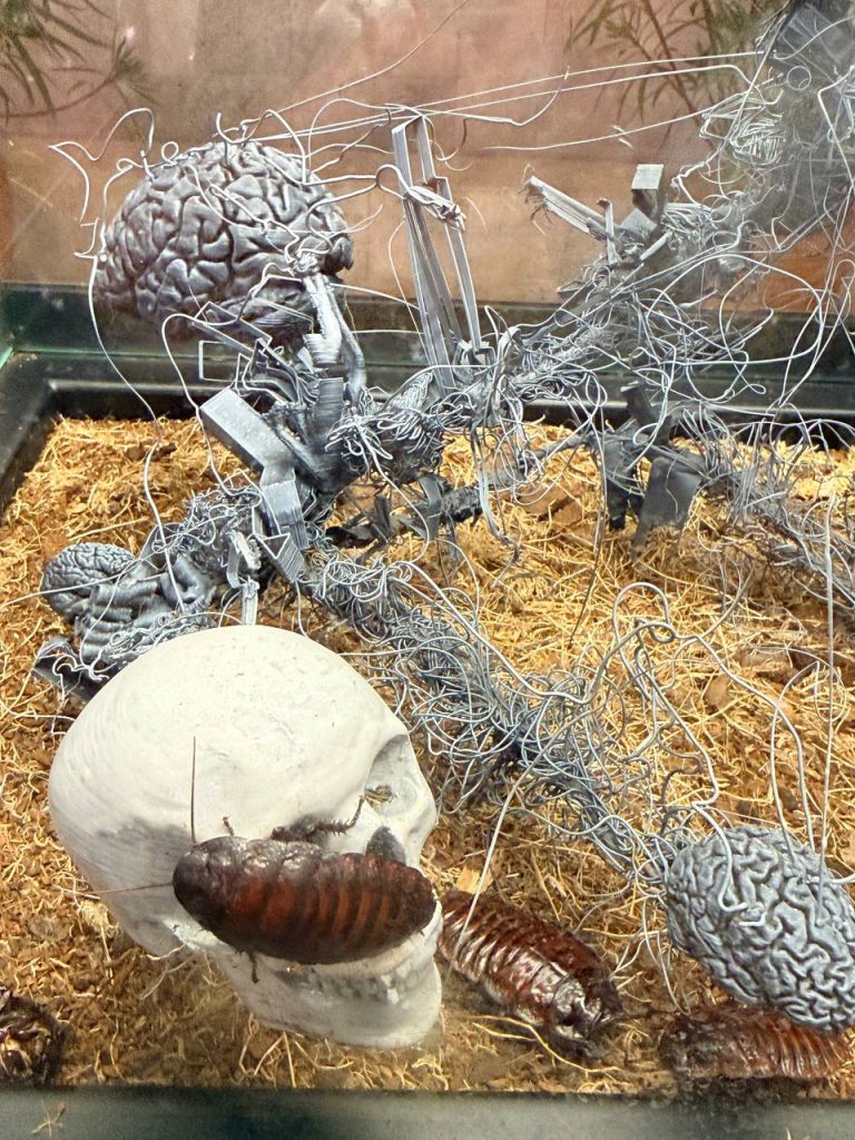 Однако абсолютный магнит для зрителей всех возрастов — шестнадцать террариумов, а вернее, их обитатели. Это не просто демонстрация экзотических животных. Это готовые сцены из фантастического блокбастера, где живые обитатели соседствуют с арт-объектами. Пауки-птицееды оплетают паутиной миниатюрные ландшафты постапокалиптического будущего, жуки-голиафы важно шествуют по крышам крошечных городов, а колонии эффектных мадагаскарских тараканов замирают на инсталляциях, напоминающих органические ткани или фрагменты космических станций. Это зрелище одновременно завораживающее и провокационное, заставляющее задуматься о хрупкости человеческого доминирования. Ну и спойлер — если вам повезет и вы попадете на экскурсию с прекрасным знатоком мира флоры и фауны Даниэлем, то восторгу не будет предела: покормите тараканами жабу агу и узнаете массу интересной информации.